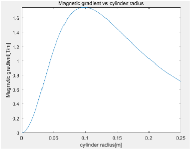 We find some interesting observations: at first, when the radius starts to increase, the magnetic gradient magnitude increased as well. However, after passing a certain radius, continuing to increase the radius of the cylinder can no longer increase the magnetic force, on the contrary, the force reduced. The reason behind is that when the surface area becomes too large the extra volume of the magnet actually providing more magnetic field at the sphere local, effectively reducing the magnetic field decay thus reducing the gradient. For a maximum magnetic force on the object, the optimal magnetic surface should have the radius roughly equal to the distance of attracting object. Of course, due to different design configurations it can be changed, but this optimal surface length can be the starting point for your magnet design.